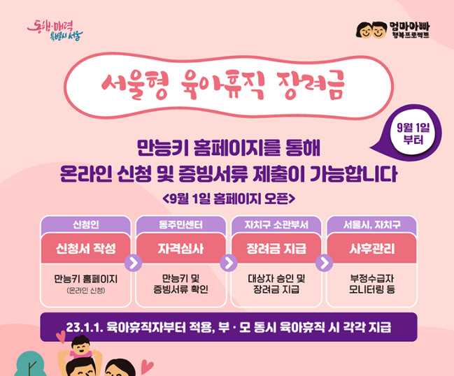 고용보험에 가입된 근로자로 2023년 1월 이후 육아휴직을 사용 중이며 육아휴직급여를 6개월 연속 수급중인 엄마아빠가 서울형 육아휴직 장려금 지원대상입니다.