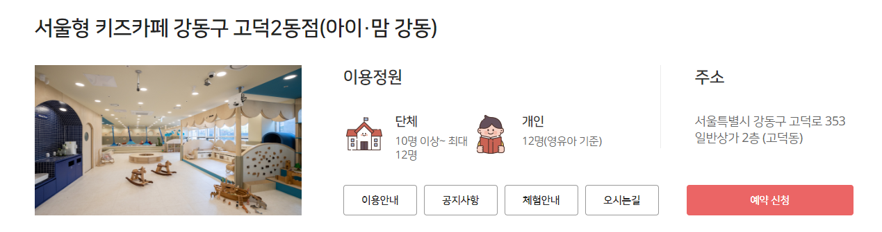 서울형 키즈카페를 이용하기 위해서는 우리동네 키움포털에서 바로 사전예약하시면 됩니다. 예약인원이 지점에 따라 15~25명으로 제한되어 있기 때문에 미리 예약하고 가시는 게 좋습니다. 예약자 1인당 영유아 수 최대 3인까지 신청되며 지인동반 가능합니다. 아동 1인당 보호자는 최대 2인까지 입장가능하며 중복예약, 대리예약은 불가합니다.