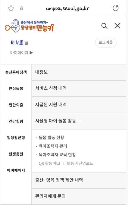 몽땅만능키 홈페이지에서 로그인 > 마이페이지 > 서울형 아이 돌봄 활동 시작