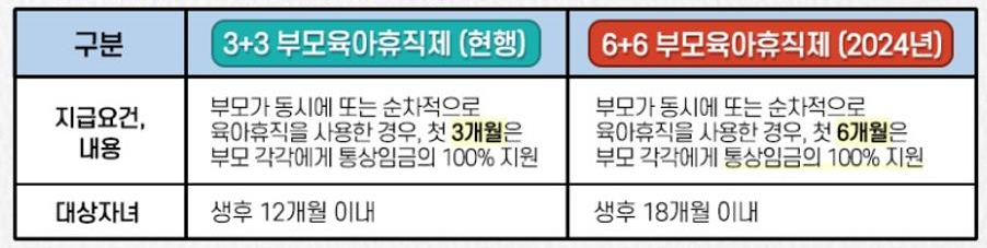 고용노동부의 부모육아휴직제 명칭부터 3+3 부모육아휴직제에서 6+6 부모육아휴직제로 변경되었습니다. 변경전에는 육아휴직시 아이가 생후 12개월 이내까지 휴직제를 낼 수 있고 첫 3개월 동안 임금의 100% 지급을 지급했는데 2024년부터 생후 18개월까지 기한이 확대되고 임금 100% 지급개월도 두 배인 6개월로 늘어나 지원이 확대되었습니다.