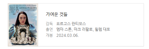 이 외 최신 개봉영화 순위중 눈에 띄는 상영중인 영화를 살펴보면 리암니슨 주연의 <탐정말로>, 엠마스톤 주연의 <가여운것들>, 러셀크로우 주연의 액션영화 랜드 오브 배드, 해외에서 호평받은 유태오주연의 셀린송감독의 자전적 영화 <패스트 라이브즈> 등이 있습니다.