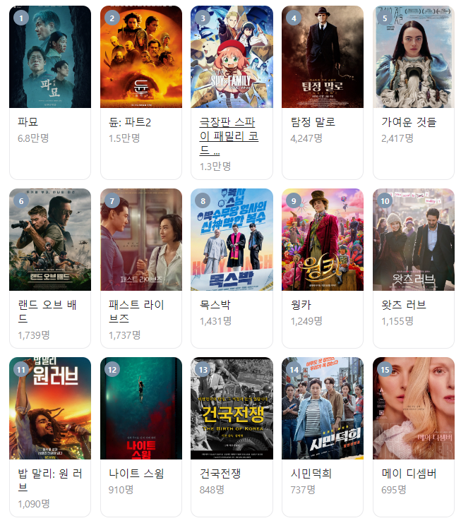 현재상영중인 영화 중 가장 인기 있는 영화는 입소문을 타고 누적관객수가 늘어나고 있는 한국의 공표영화 <파묘>입니다.
